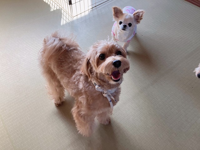 後ろでは超マイペースチワワちゃんが、”何してるの?”とちょっとキョトン、とした