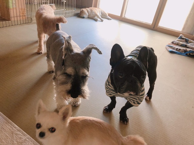 お泊りチームのフレブルちゃん、先輩のシュナちゃんやちょっと長いお泊り中のチワワちゃん