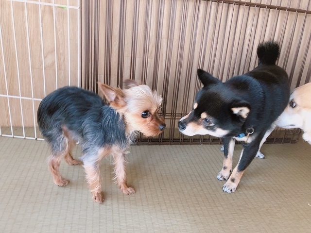控えめさんなヨーキーちゃんと、柴ちゃんが静かにご対面。ゆっくり近づいて、クンクン、