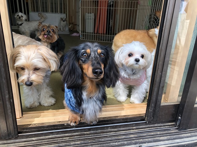 ベテランダックスちゃんに、後輩のミックスちゃん、ぞろぞろとみんなで窓辺に集まって、