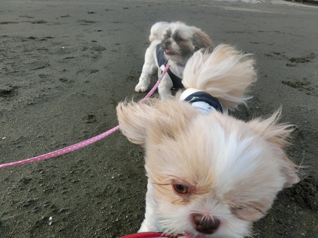 湘南のペットホテル、少し足を延ばして海岸散歩。解放的な環境でみんなのびのびです。