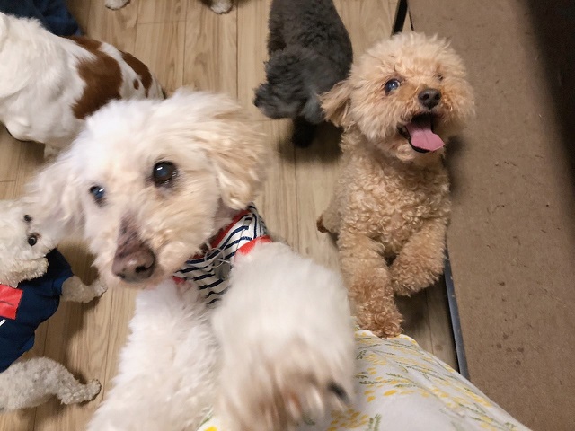 とっても甘えん坊さんなおふたり。朝からシッポを全力フリフリ、人間に甘えております。