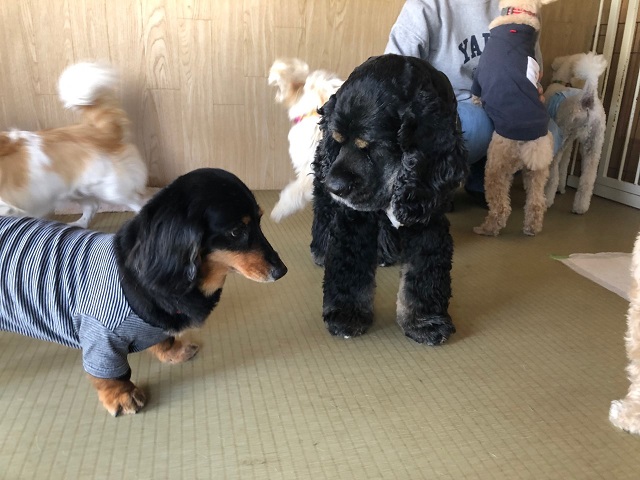 超マイペースなシニアダックスちゃんとコッカーちゃん。以前にも何度か顔を合わせた