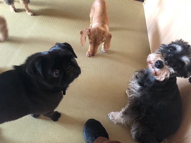 も出来たようで、落ち着いた雰囲気。いつもは慎重なシュナちゃんですが、パグちゃんの