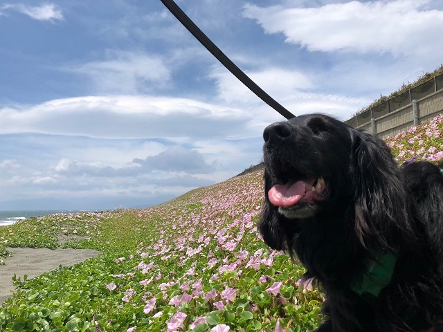 ハマヒルガオがとっても美しい海岸。笑顔が弾けるフラットちゃん。海岸散歩が大好きで