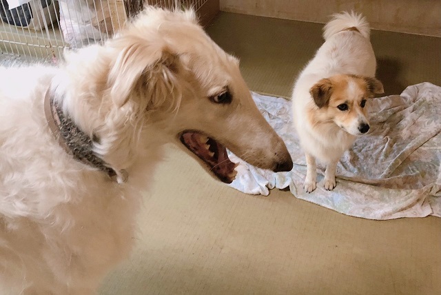 とってもとっても穏やかでマイペースさんなミックスちゃんとベテランボルゾイくん。