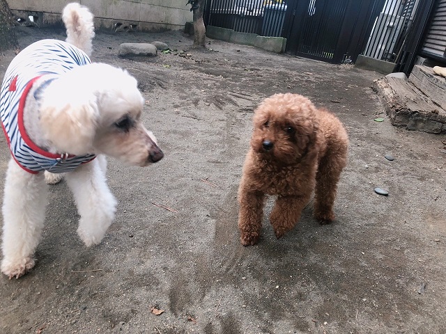 そこへ先輩トイプーちゃんが元気に走ってきて、”ねぇねぇ、何してるの?”なんて話しかけて