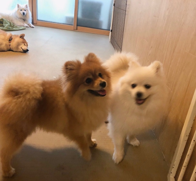 とっても陽気で遊び好きなポメちゃんコンビ。会うなりすぐさまじゃれ合いっこを