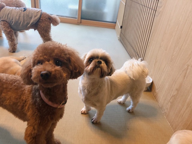お泊りチームのトイプーちゃんとシーズーちゃん、なにやらちょっと真剣な表情で佇みながら