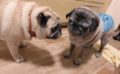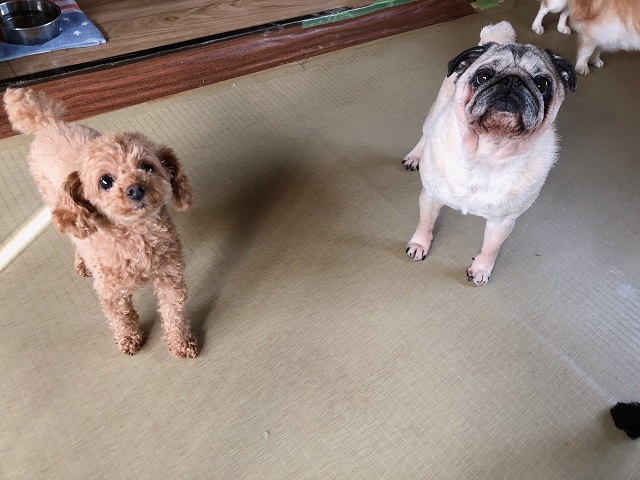 くりくりのおめめで見上げるトイプーちゃんとパグちゃん。なんだかちょっと期待の