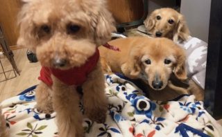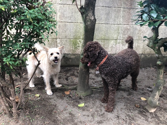初対面ながらもすっかり良き遊び仲間になっているミックスちゃんとドゥードルちゃん。