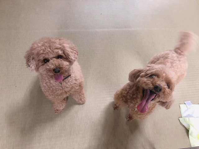 とっても人懐こいトイプーちゃんコンビ。ひとりは全力でシッポフリフリ、ひとりは