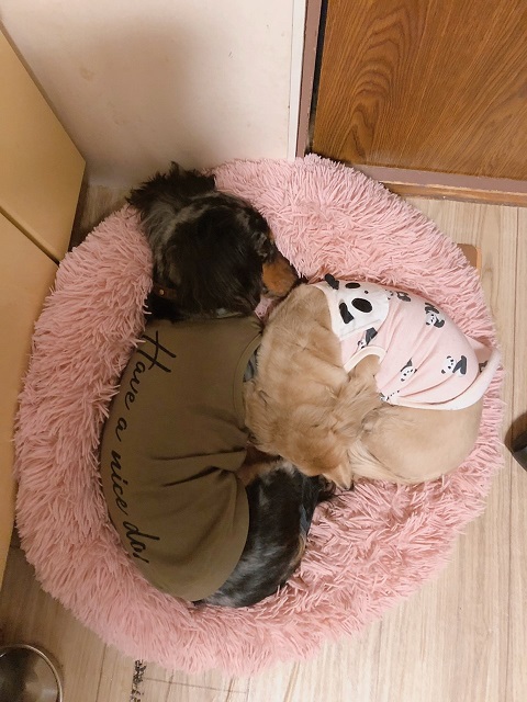 とっても仲良しのダックスちゃんコンビ。まるで”巣”にいる親子のような(笑)