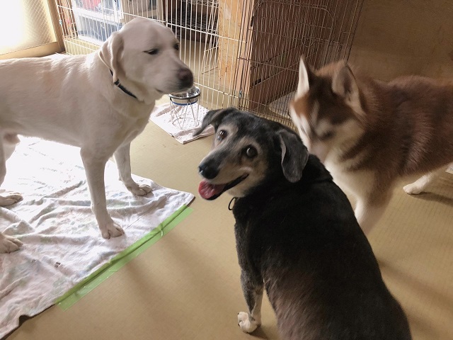 初対面のお三方。最近仲間入りしてくれたラブちゃん、ハスキーちゃんたちヤングチーム