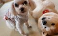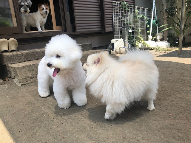 最近仲間入りしてくれたビションちゃんと、いつもお元気なポメちゃん。お庭には日陰ゾーンが