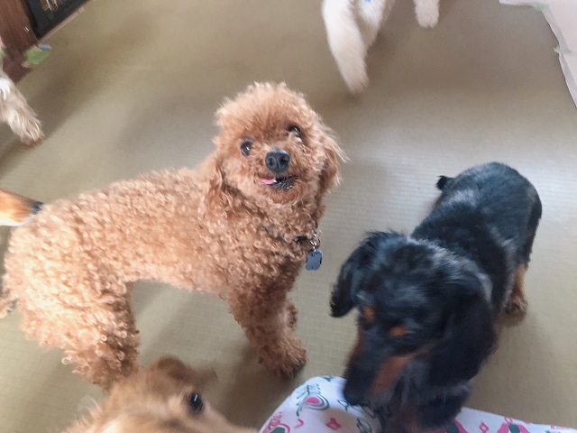そのまま遊びモードに!スイッチが入る瞬間も、わんこたちそれぞれで、本当に興味深いものです。