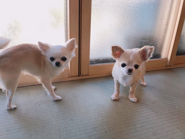 偶然、同じような背格好、カラーのチワワちゃんが遭遇。ちょっと控えめで、でもしっかりと