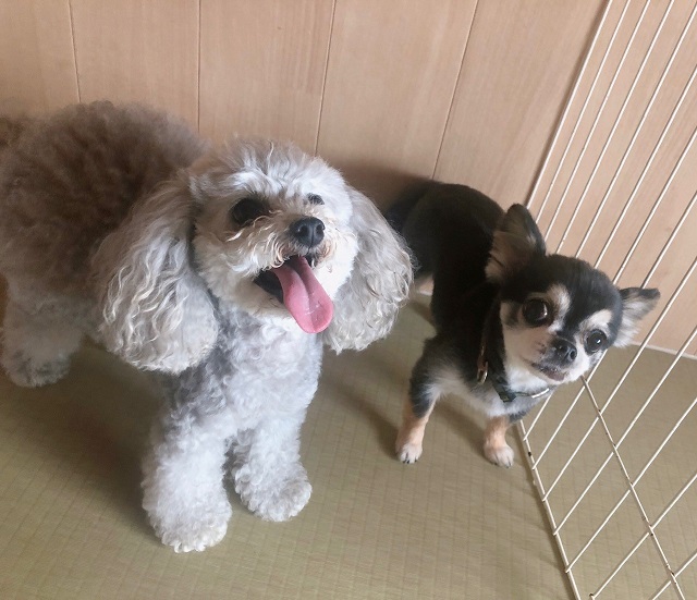 先輩チワワちゃんとごあいさつ中のトイプーちゃん。とってもオープンな性格のトイプーちゃん