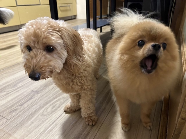 マイペースチームのおふたり、先輩のポメちゃんが(ちいちゃいけれど)大きなお口を
