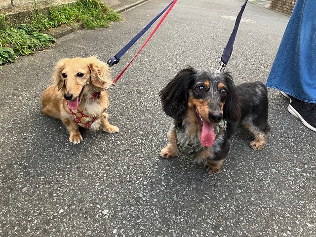とっても仲良しなダックスちゃんコンビ。お散歩途中でちょうど会ったので、ツーショット
