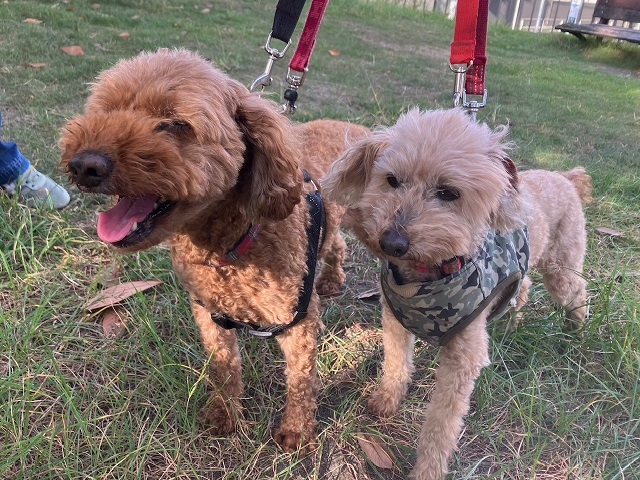 お散歩が大好きなトイプーちゃん兄弟、上手に並んでトコトコと軽快な足取り。