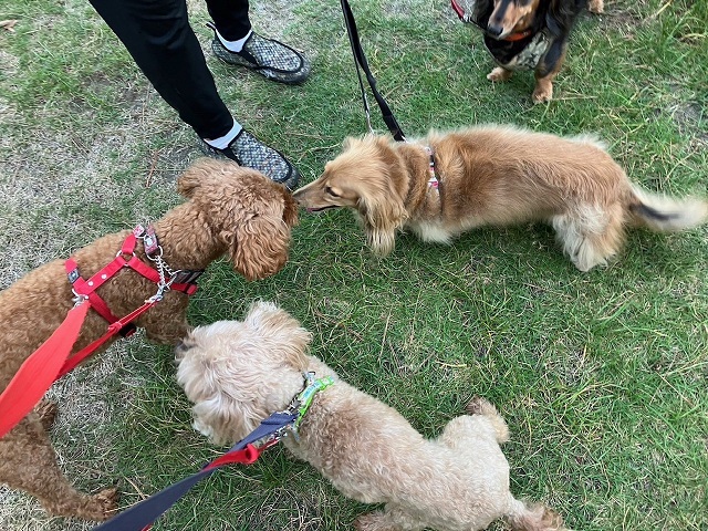 近所の公園で気ままに散策していたトイプーちゃん兄弟のところへ、同じくお泊りチームで
