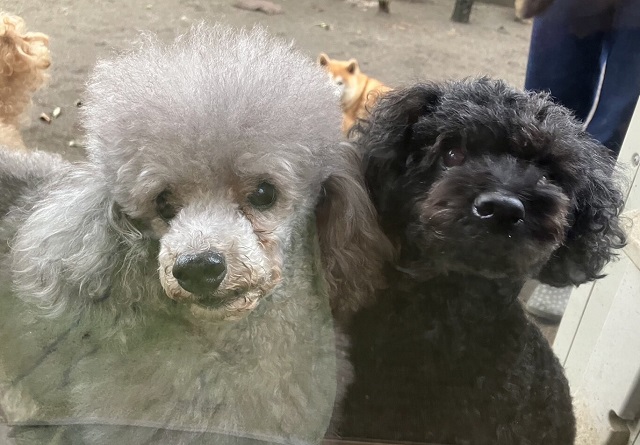 お庭散策を済ませてきたトイプーちゃんおふたり、枕木ゾーンからお部屋を眺めて、