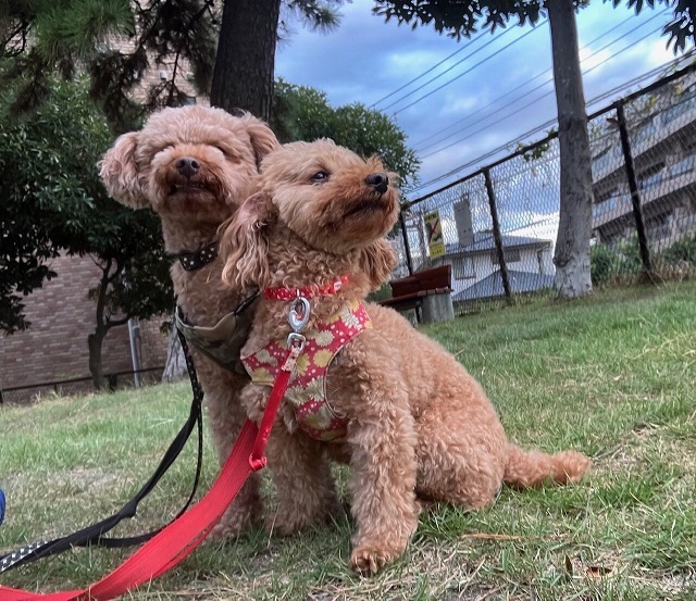 お散歩でリフレッシュ中のトイプーちゃん兄弟。ピッタリとくっついて佇む姿が、ふたりの