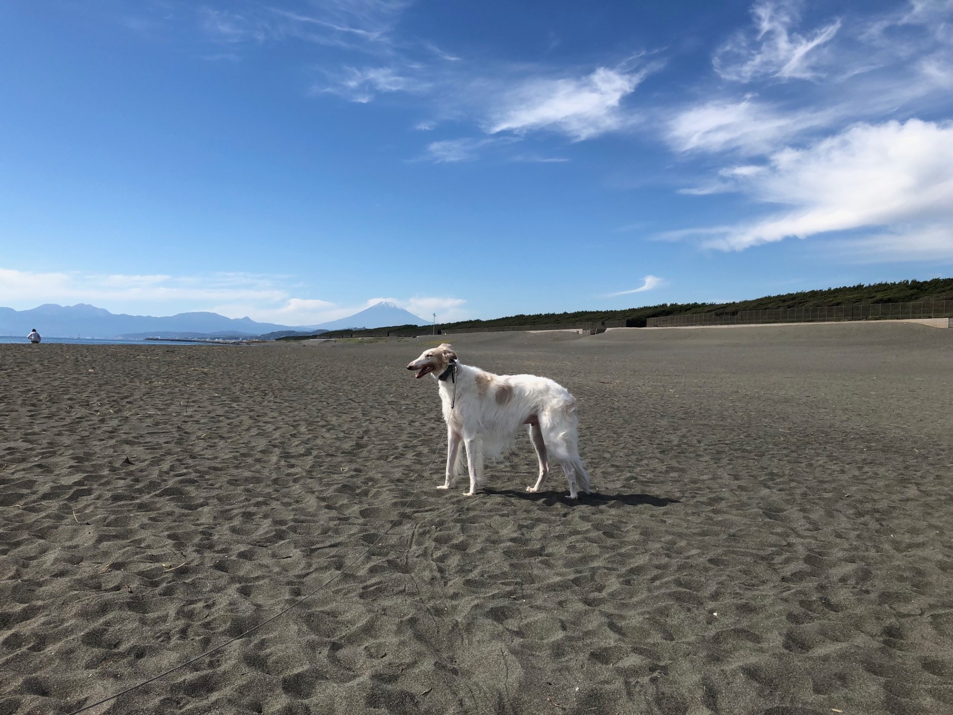 富士山、そしてひろーい砂浜に佇む姿。とっても犬らしくてカッコよく、白い被毛も