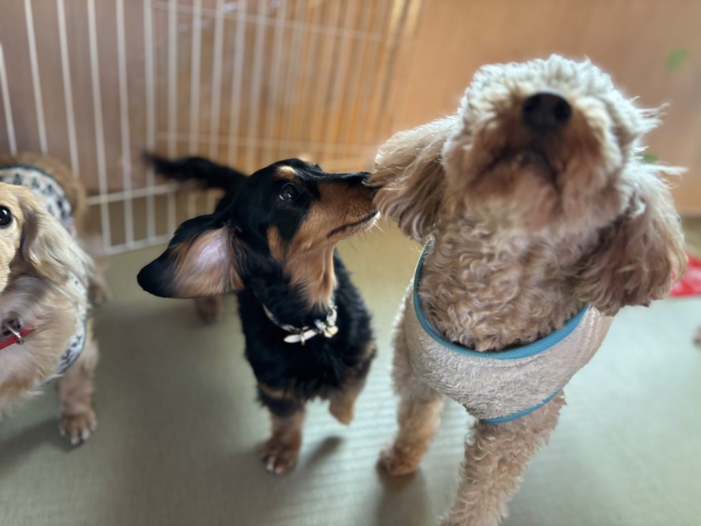 トイプーちゃんはなんだか人間を見上げながらちょっと真剣に、それをまた真剣にクンクンしているダックスちゃん。