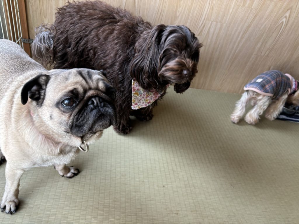 とってもとってもマイペースで穏やかなパグちゃんとドゥードルちゃん、お部屋も一通り巡回して、