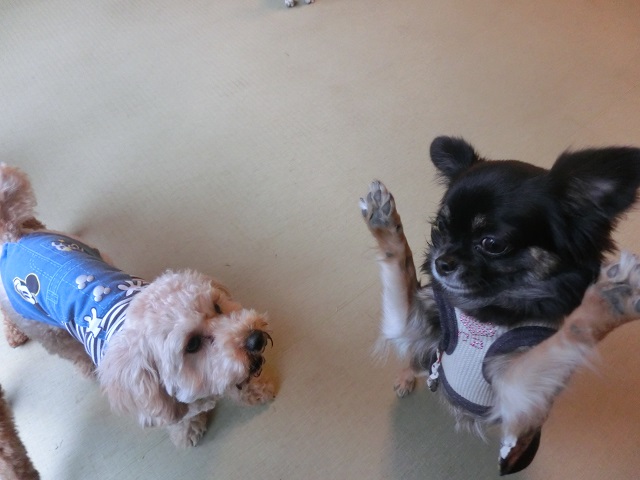 仲良しさんふたり、会うなりかけっこ、プロレスごっこ。チワワちゃん、必死で大きさアピール?してます(笑)