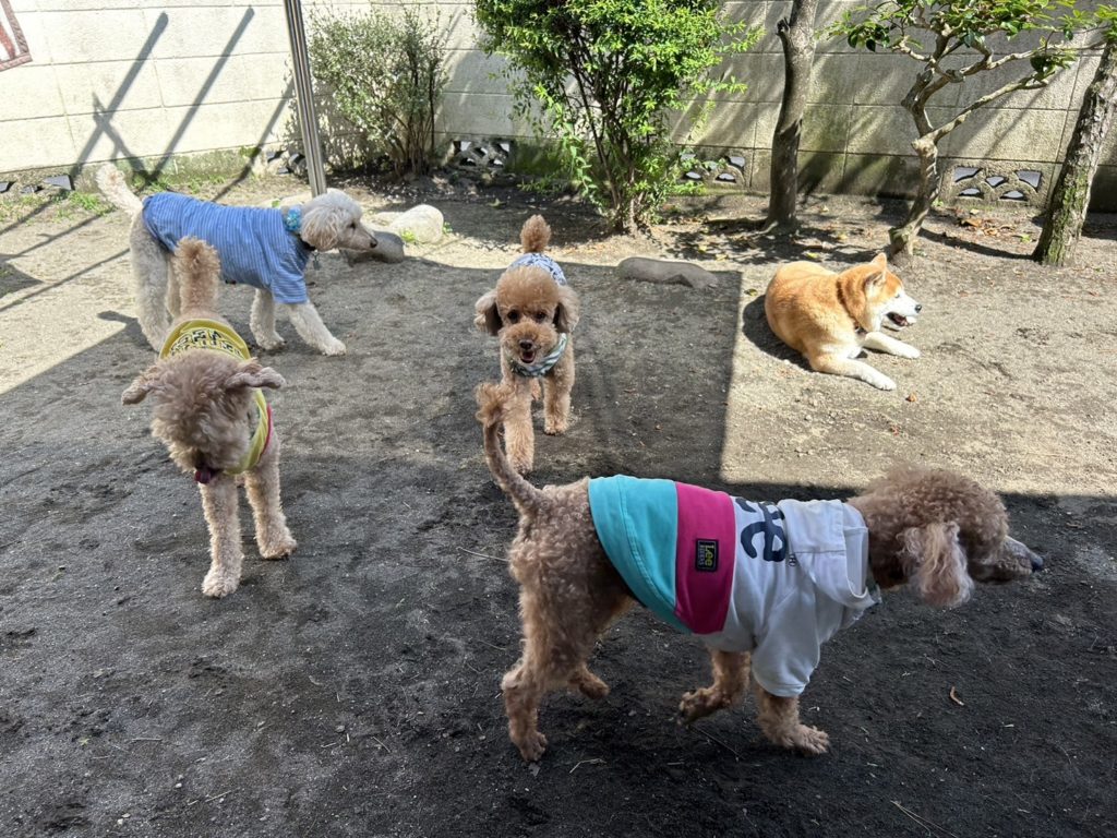トイプー4+柴姉さんチーム。ちょっとお日様も出てくれたので、お庭でリフレッシュタイム。