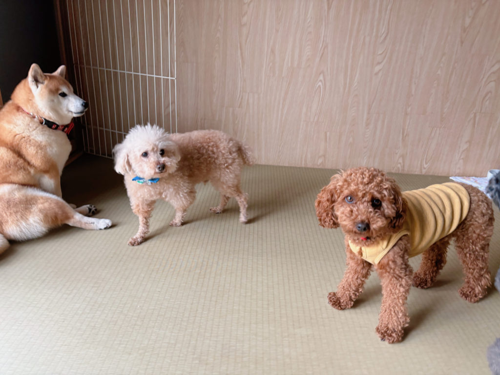 通いチームのトイプーちゃんとお泊りチームのトイプーちゃん、それに窓辺で今まさにくつろごうと