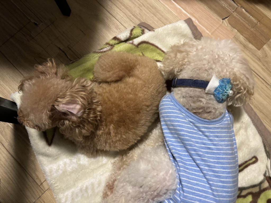 お布団ゾーンで”ちょっとだけ”くっついてお昼寝中のトイプーちゃんたち。おふたりともシニアさん