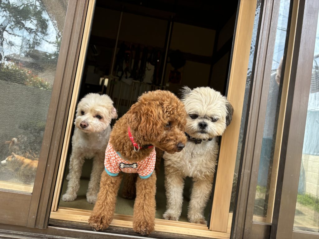 子たちはまず窓辺で佇む。このあと、トイプーちゃんと左のマルプーちゃんはお庭へ出かけて気ままに散策、