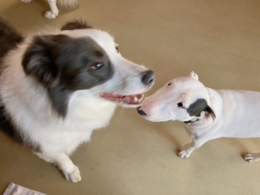 通いチームのブルテリアちゃんといつもお泊まりにきてくれるベテランボーダーちゃん。