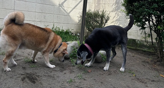 ちょっぴり長いお泊まり中の柴&ミックスちゃん兄弟。お庭散策中、二人で同じ所をクンクン入念に
