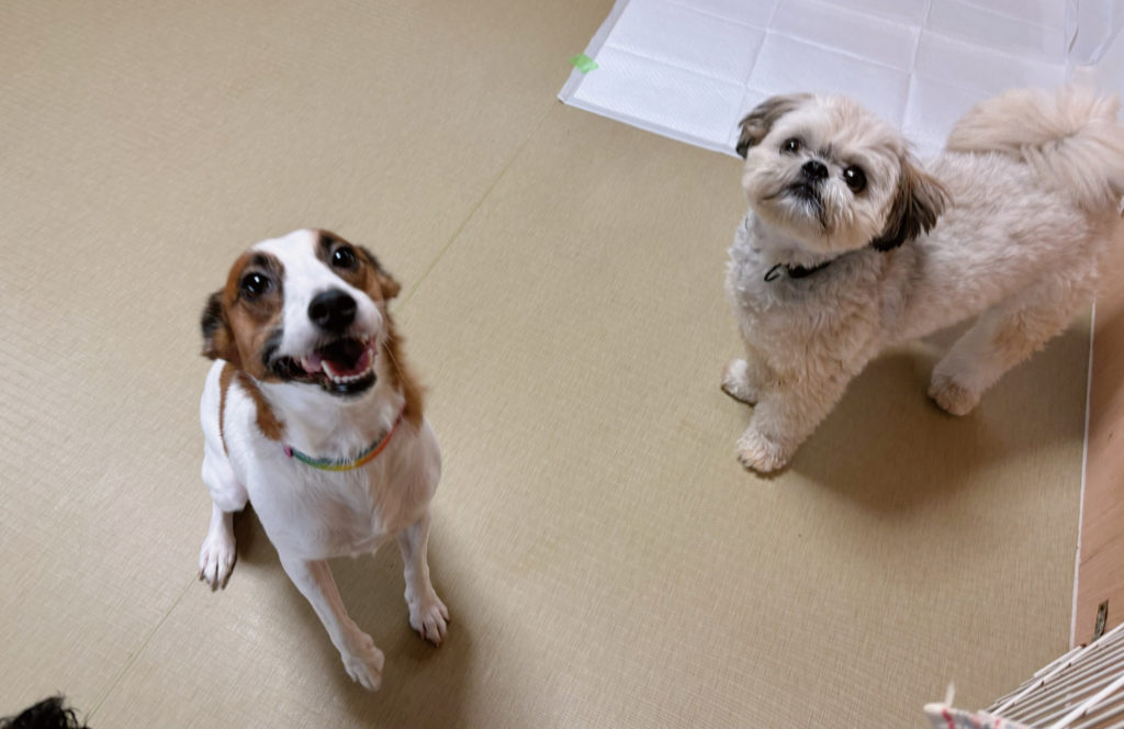 お泊りチームのジャックちゃんとミックスちゃん、ジャックちゃんは立派なお耳をぺちゃーんと