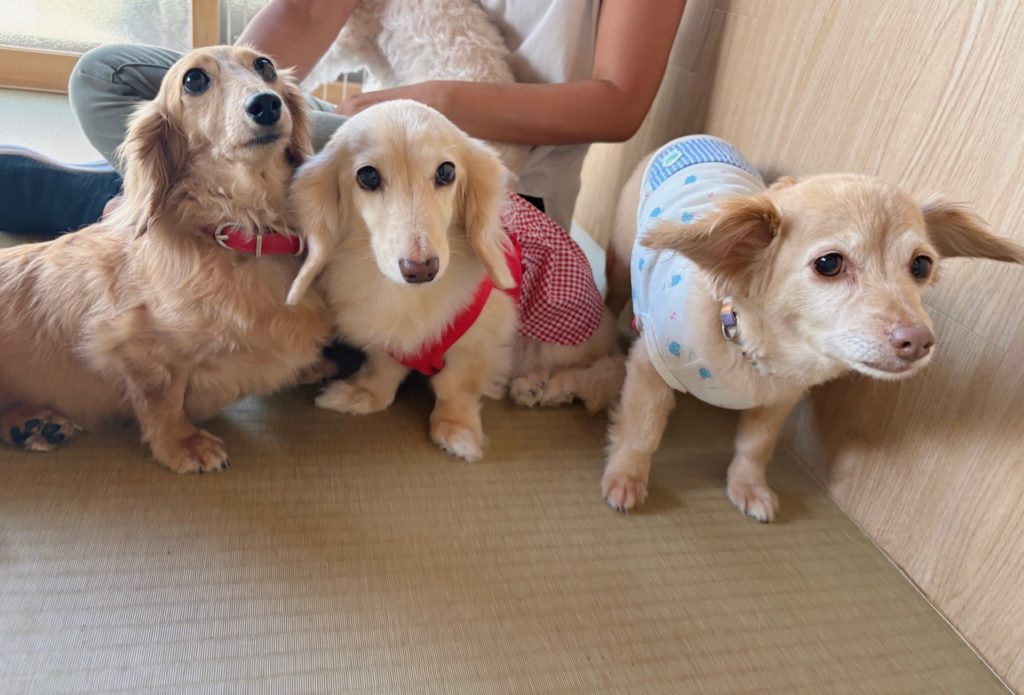 人間の近くに集まっていたわんこのうちのベテランお嬢様たち。”ぐうぜん”にもキレイに横並び