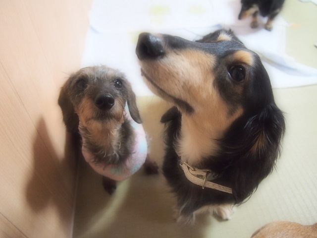 <くつろぎの一軒家、湘南茅ヶ崎のペットホテル>おだやか ペットホテル日誌 2014.12.05 「くんくん、何やらおいしそうな香りがするぞ。」「え?ほんと??どこどこ???」 鼻が利くダックスちゃん、立派なお鼻を高々と上げて一生懸命何かをキャッチしようとしています。 それを不思議そうに眺めるワイヤーダックスちゃん。二人ともとっても穏やかな表情で、とっても可愛い♡ 湘南のペットホテル、のんびりまったりムードがわんこたちの表情も柔らかくしてくれるようです。