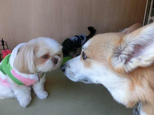 いつもは控え目なシーズーちゃん、今日はいつもより積極的にがんばってみました!同じく控え目なコーギーくん