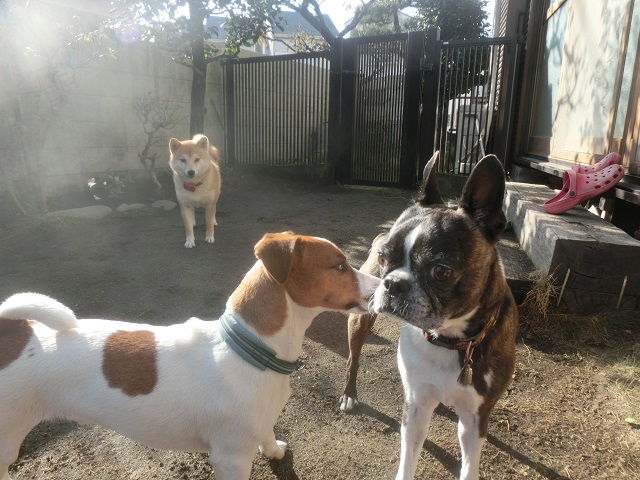 はじめまして。のごあいさつはお庭から。先輩のボストンテリアさんに「よろしくお願いしまっす。」と