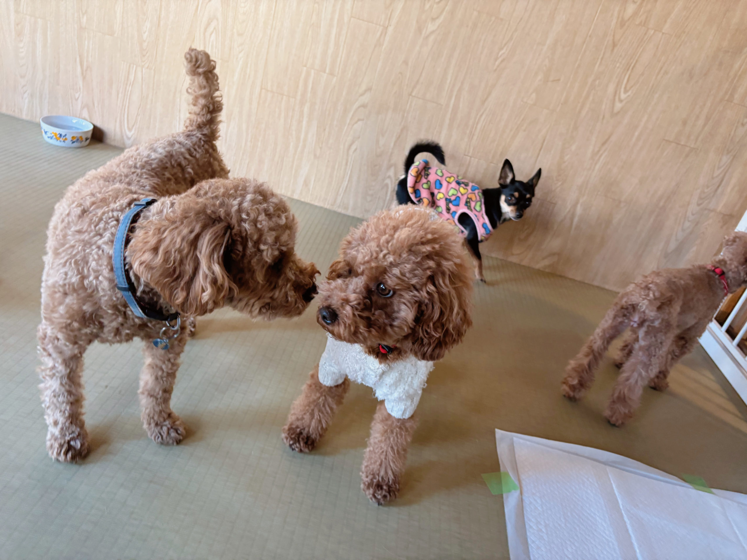 おっとりプーさんたちが、のんびりお話し中。毎週顔を合わせているので、もうすっかり顔馴染み同士、何の緊張も警戒もなく、フラットな状態でコミュニケーションをとることができます。クンクンクン、お鼻を近づけて、チラッと目を見ながら、どんなお話しをしているのでしょう。二人の周りには穏やか柔らかな空気が漂っていたので、きっとお話しも上手く出来たのだと思います。毎週会うたび、自然と距離感も近くなり、何度も交流するうち親近感も湧いているようで、時々じゃれあって遊ぶ姿も見られるように。そんな光景はとてつもなく愛おしく嬉しいもので、これからもどんどん絆を深めてほしいなあ、なんて人間は勝手に想像もしてしまいますね。目には見えないですが、確実に友情の芽は育まれているようです^_^