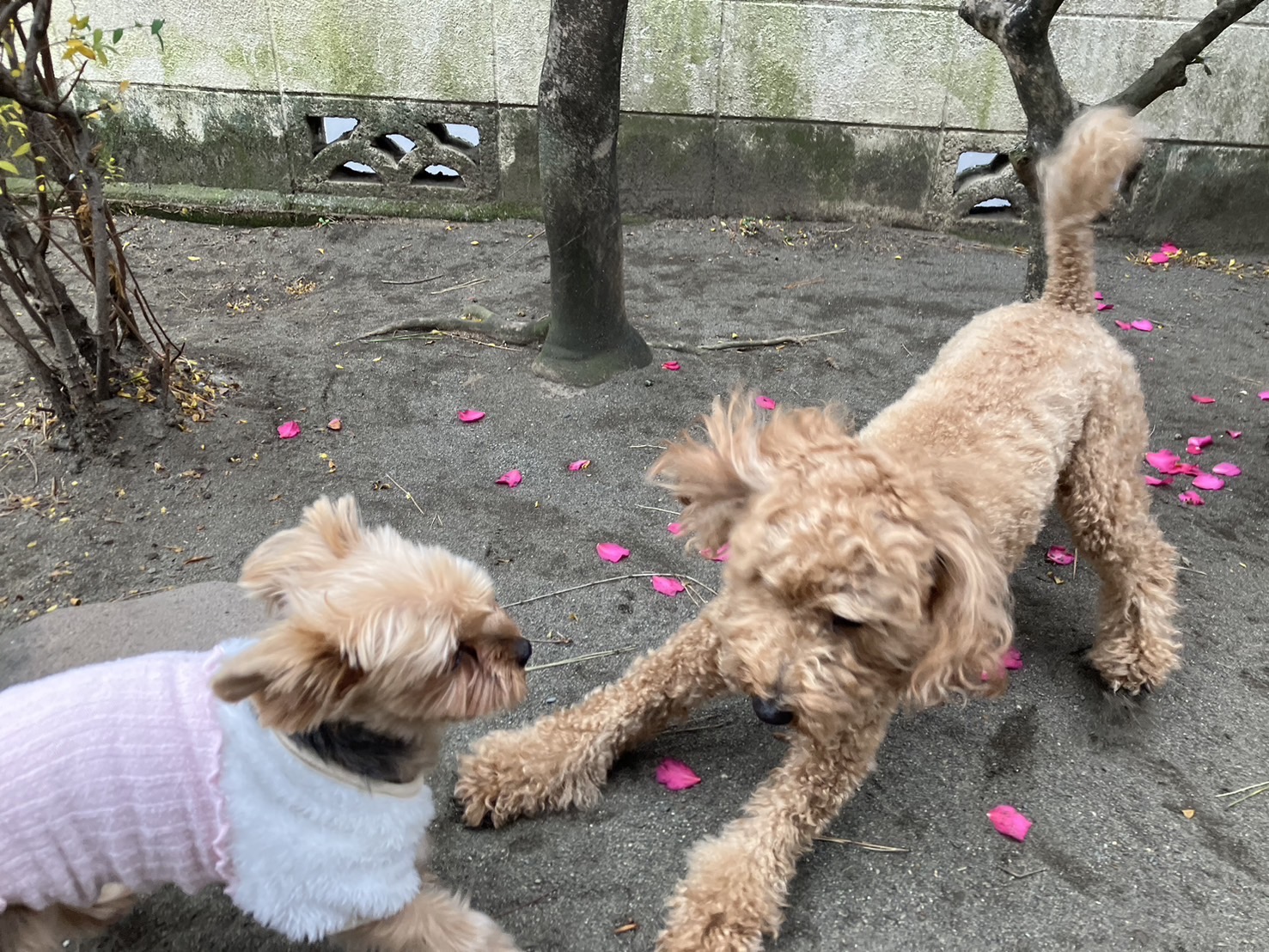 お庭でヤングチームお二人がじゃれあって遊んでおりました。まず最初に誘ったのはトイプーちゃん、前足で”タンっ”とプレイボウの格好をして、積極的に遊ぼうアピール、最初はちょっぴり戸惑っていたヨーキーちゃんも、トイプーちゃんの天真爛漫さにココロがほぐれたようで、お誘いに応えてくれました。時々フェイントをかけたり、一気に走り出して追いかけっこをしてみたり、犬らしさ全開で思い切り遊ぶ姿は、とても清々しく、犬同士でしか出来ない遊び方やじゃれあいがあるので、とても良い刺激にもなりますね。