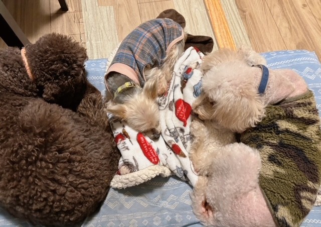 お布団ゾーンでしっかり二度寝をするお三方。人間にもなでなでしてもらったし、ごはんも食べて、