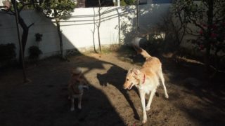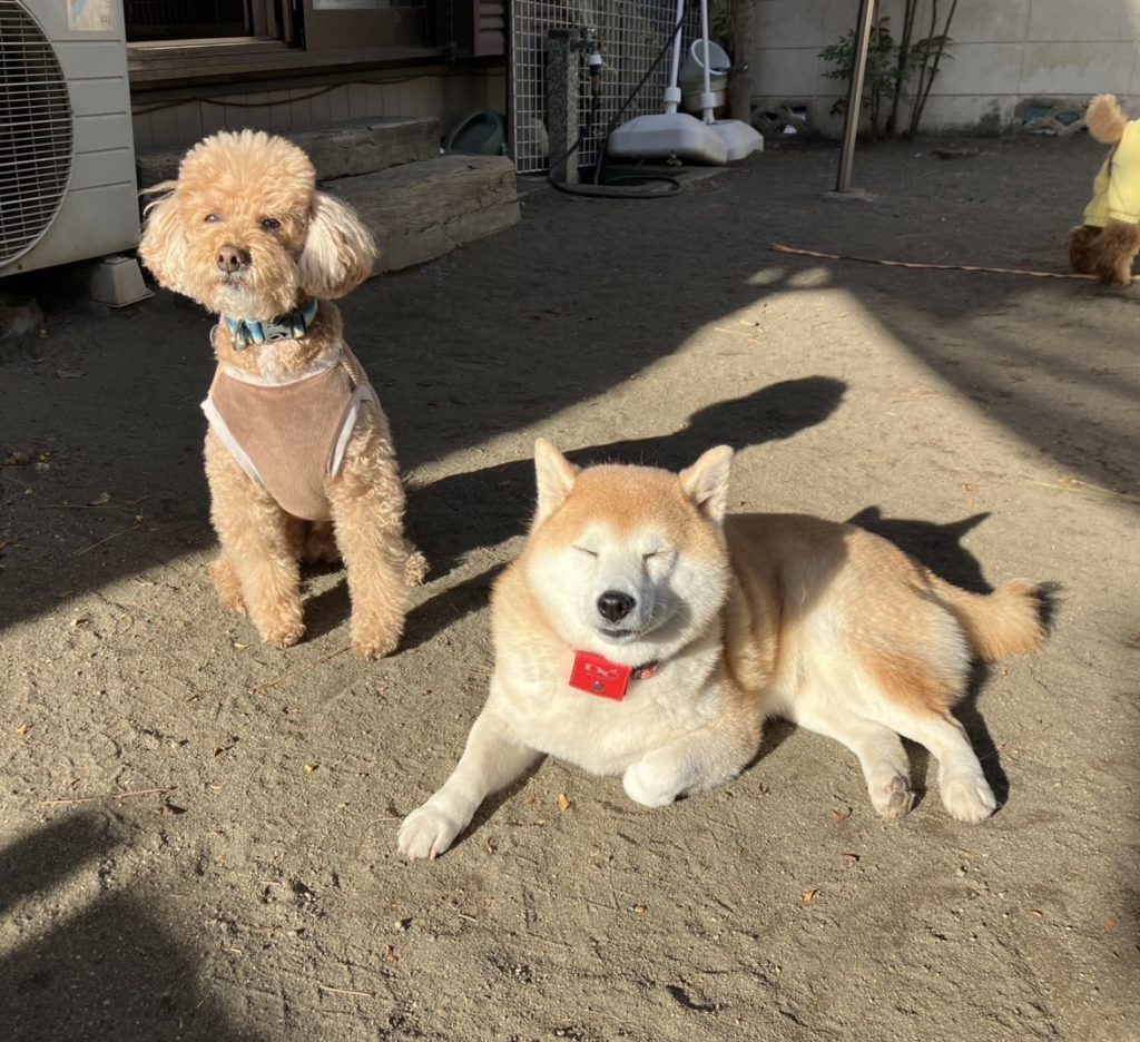 陽だまりゾーンで一身にお日様の恵みを受ける柴姉さんとトイプーさん。ベテランふたりの、