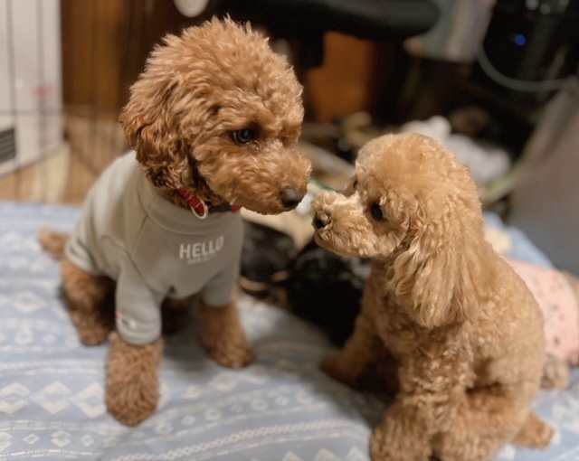 先輩&後輩トイプーちゃんが、お布団の上でクンクンお話し中。とっても和やかな柔らかい空気が