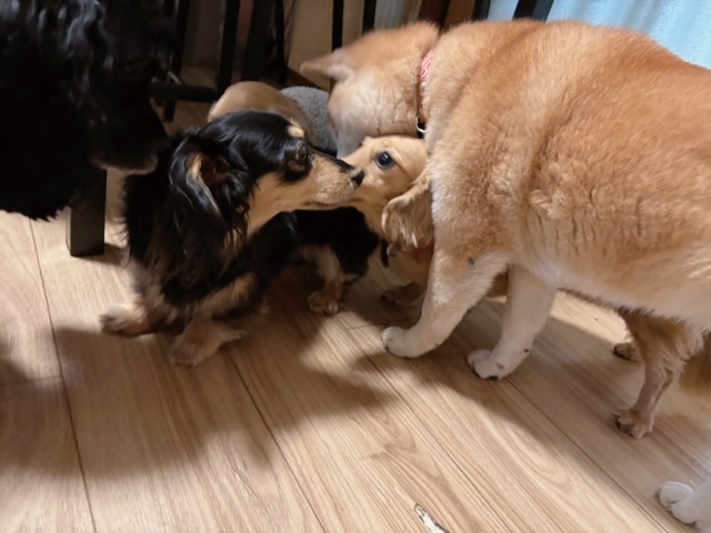 ダックスちゃんが到着すると、先輩方がわらわらと集まってきて、すかさずクンクンチェック。