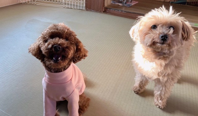 お泊り組の穏やかさんおふたり、シニア先輩のミックスちゃんと、後輩のトイプーちゃん。朝から